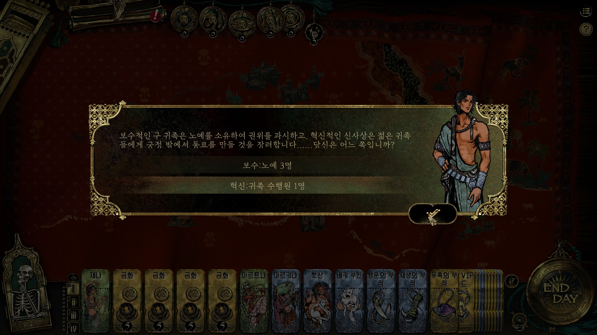 권력 게임: 술탄의 궁정에 나아가기. 나아가지 않았는데 다른 신하들이 나를 비판하면 나중에 문제가 생겨서 술탄에게 페널티를 당한다