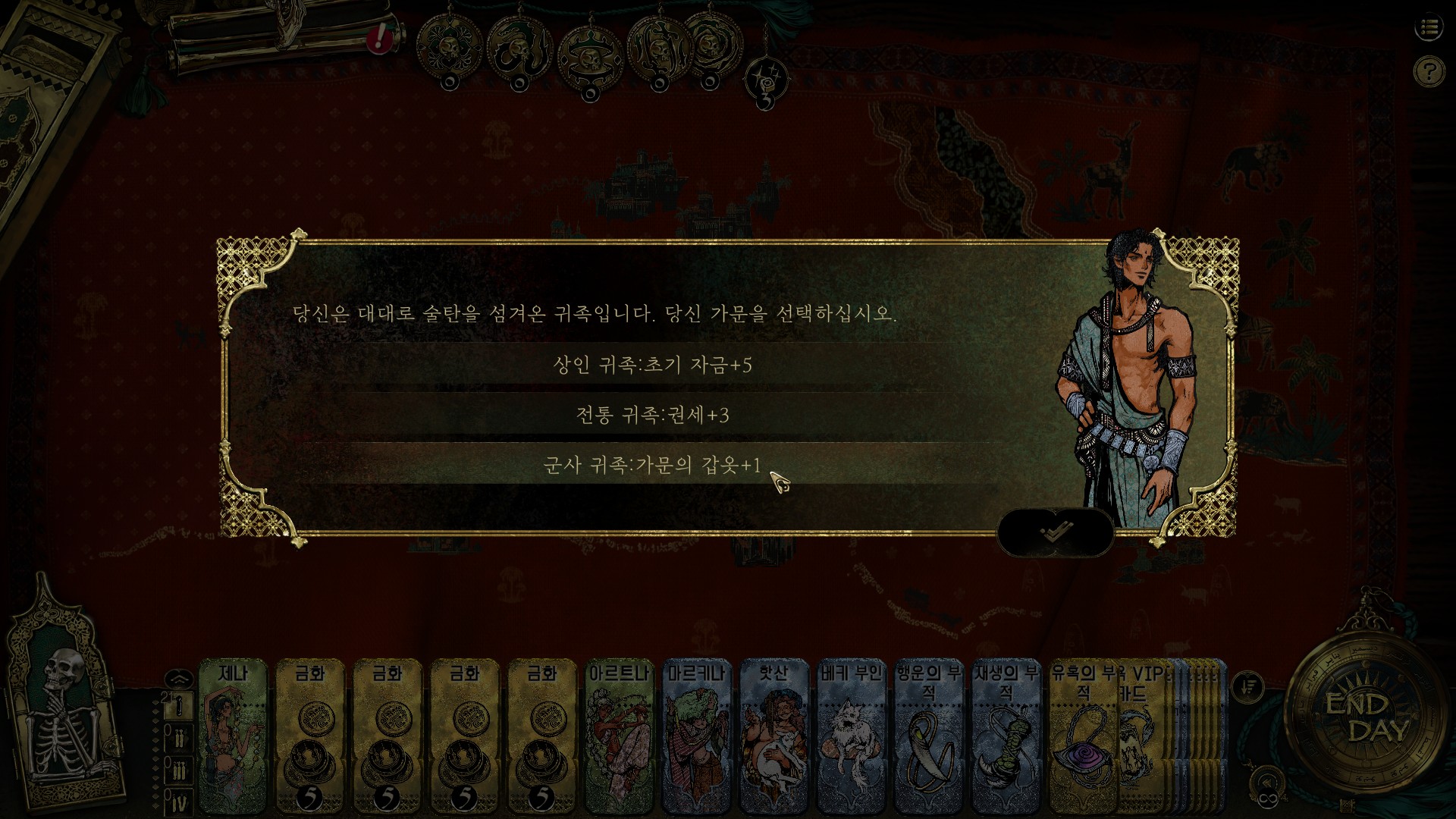 주인공은 반드시 귀족으로 시작한다. 단 상인인지 전통인지 군사인지가 다른데, 상인의 +5는 그다지 매력적인 선택지가 아니고 전통의 권세+3은 걸리적거리는 수가 있다. 군사귀족은 갑옷을 주는데 이걸 업그레이드하면 쓸만하므로 난 이걸 고른다.