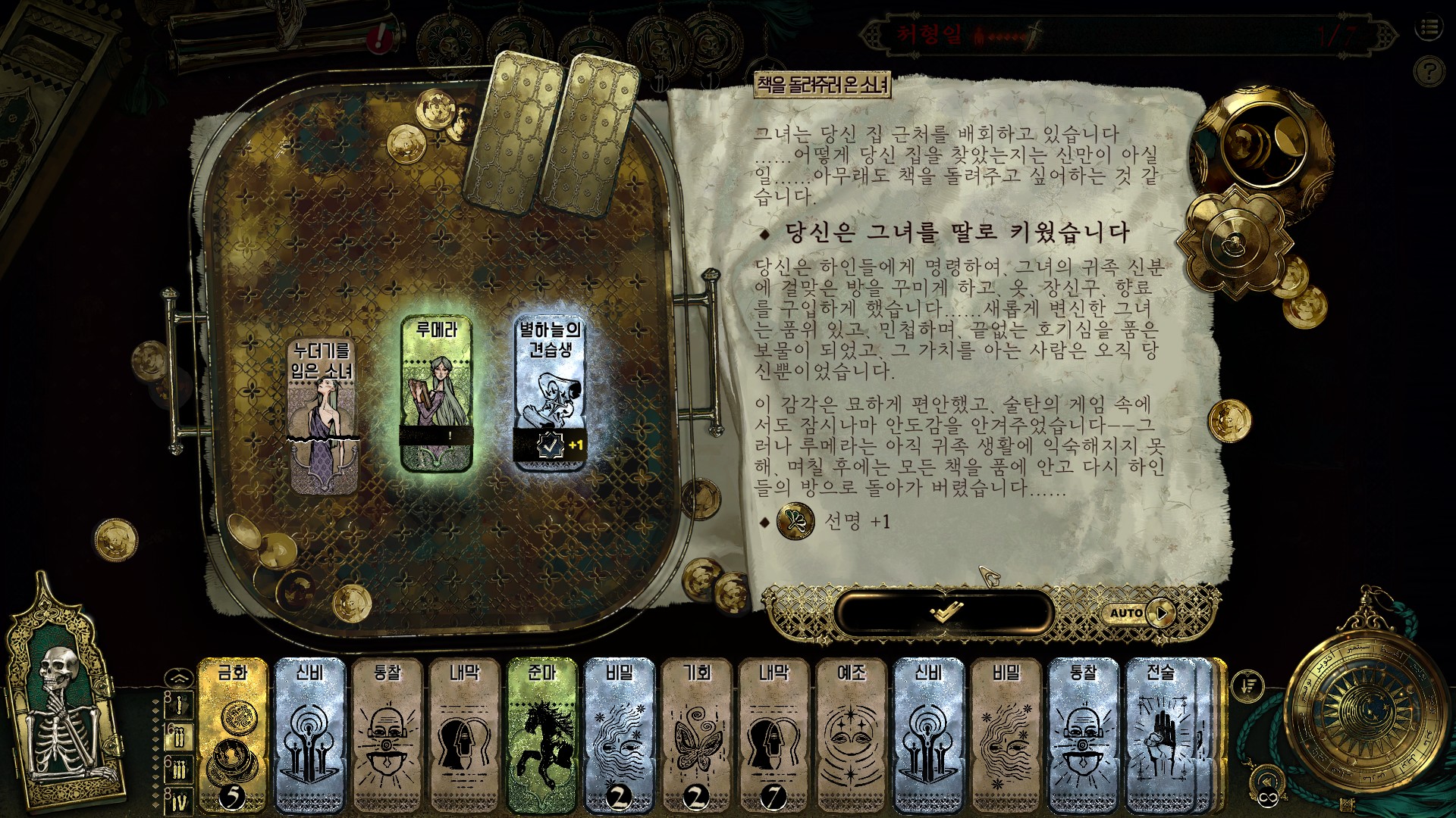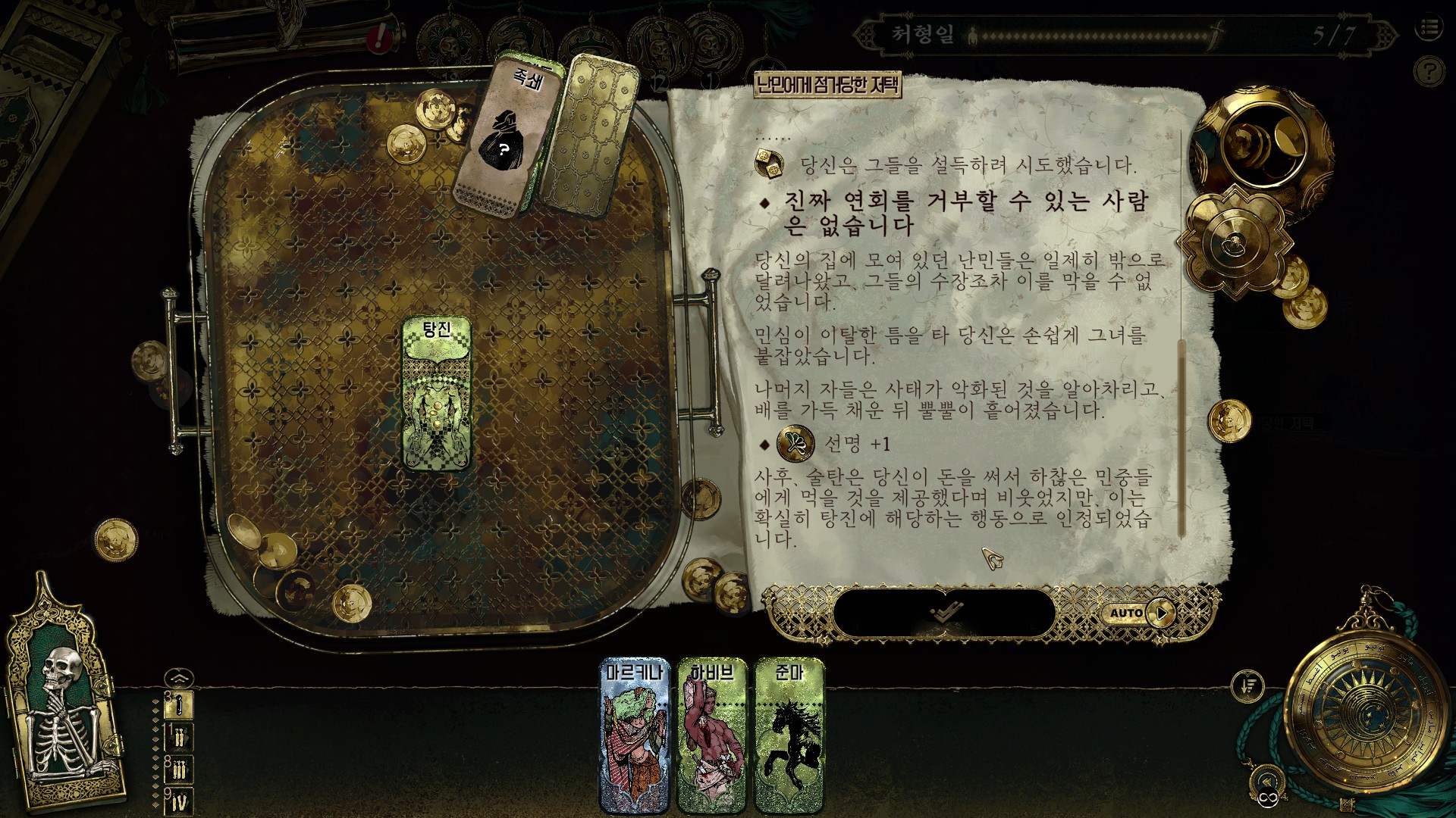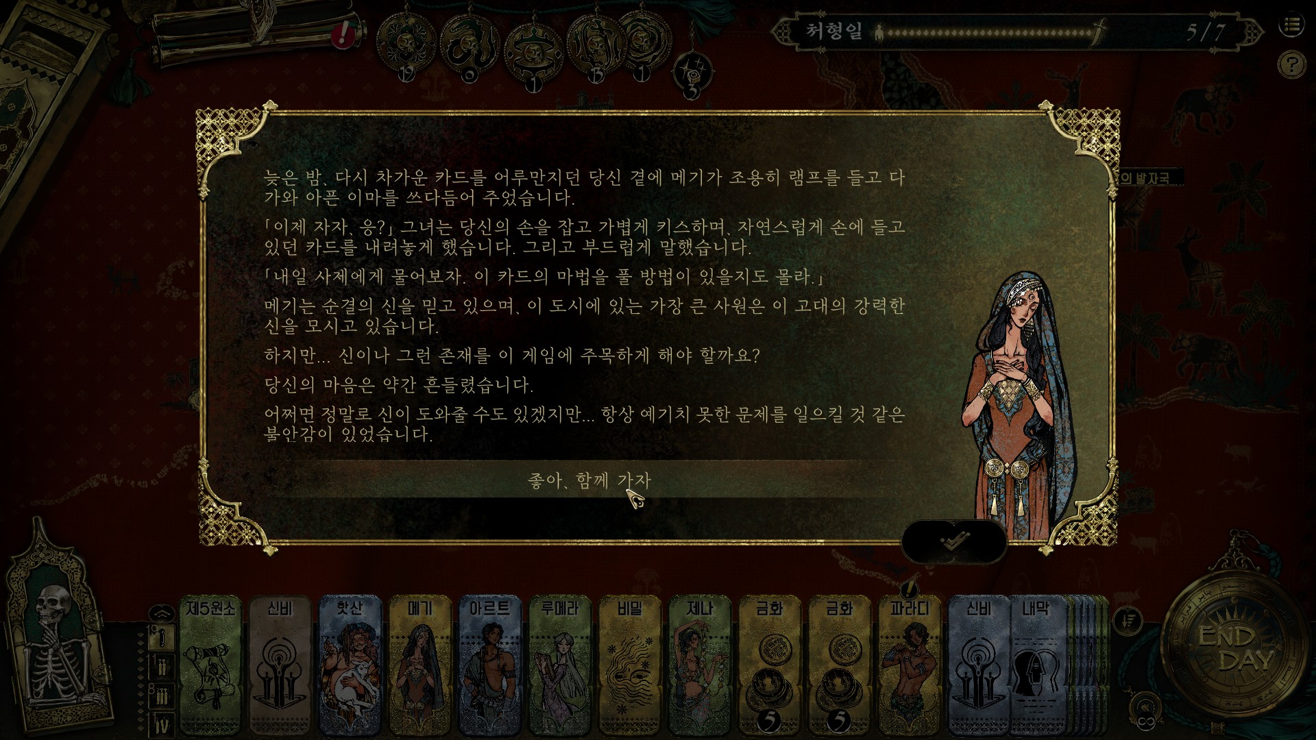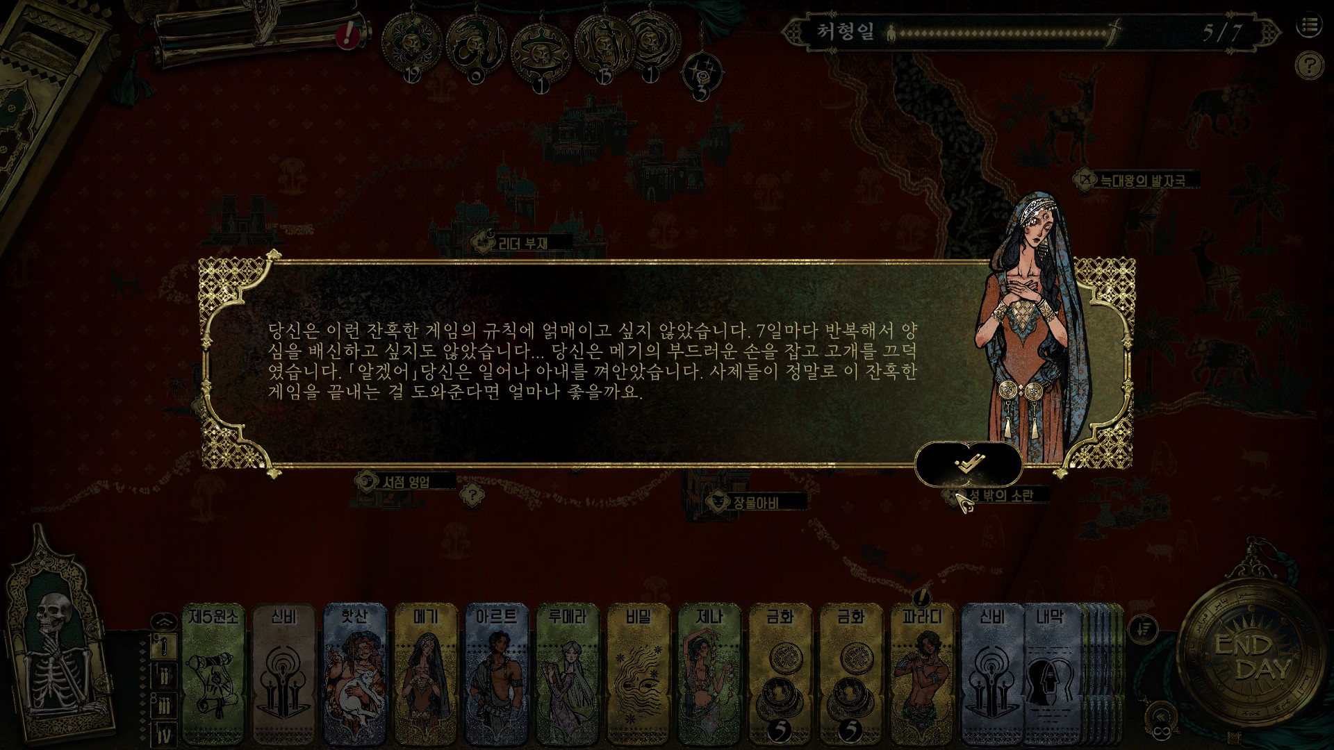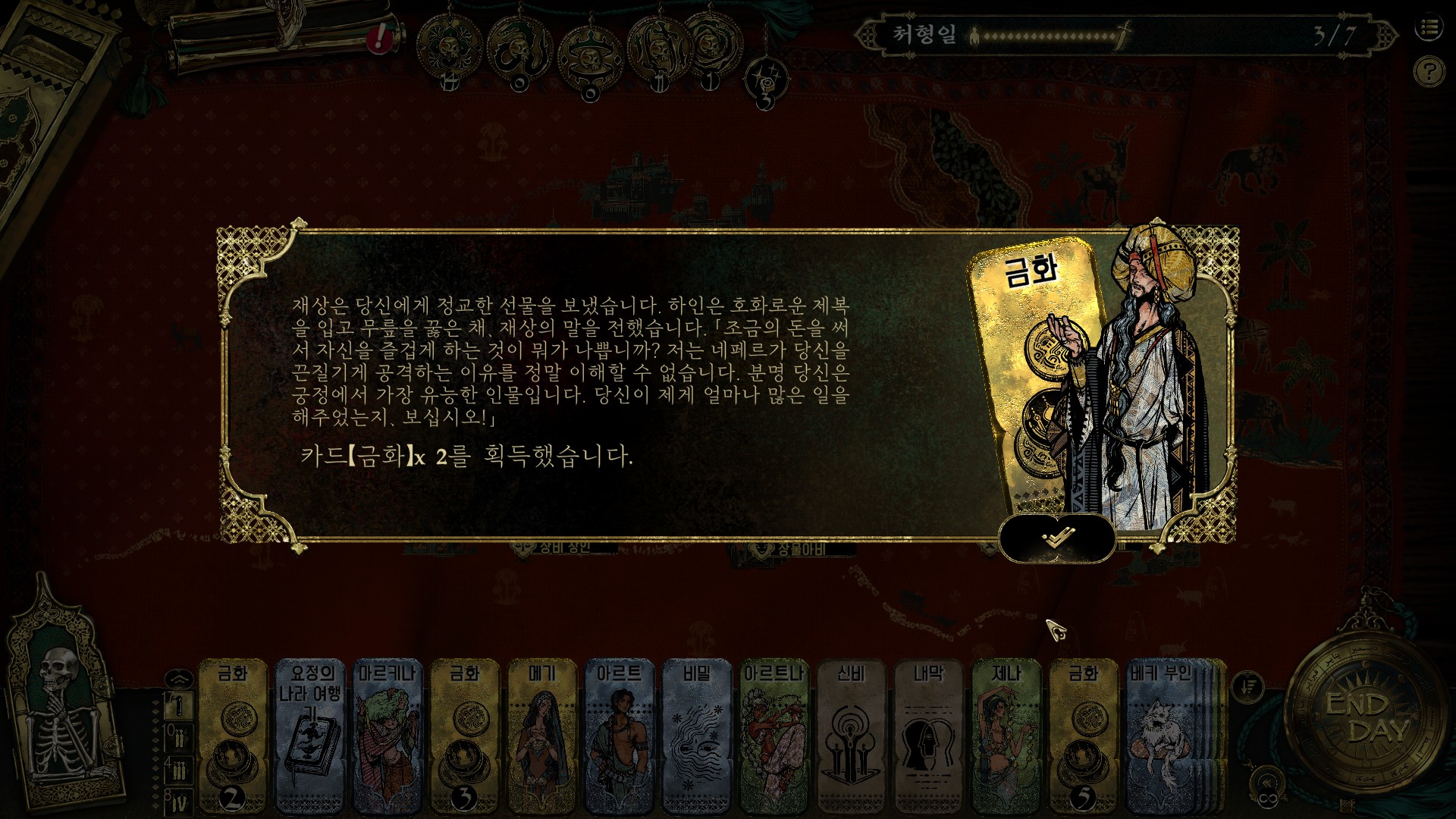 일정 턴이 지나면 메기가 한번 사제에게 부탁해서 카드를 풀어볼 방법이 없는지 제안하자고 하는데 이런 식으로는 술탄 카드를 없애지 못한다...