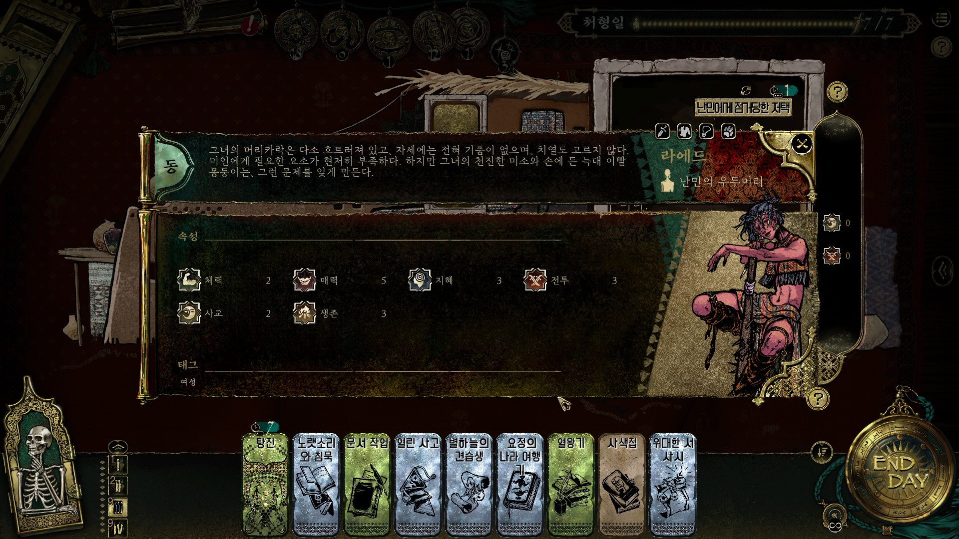 난민에게 둘러싸인 저택 이벤트는 전투로도 해결 가능하고 탕진 카드를 써서도해결 가능하다. 어느 쪽이든 라에드가 우두머리이고 잡히면 감옥에 갇히는 것은 같으나, 전투로 이기면 악명이 1 오른다. 라에드는 여러 능력치를 보유하고 있기 때문에 여기저기 키워서 써먹을 만하지만 한편으로는 어느 능력치도그다지 높지 않다