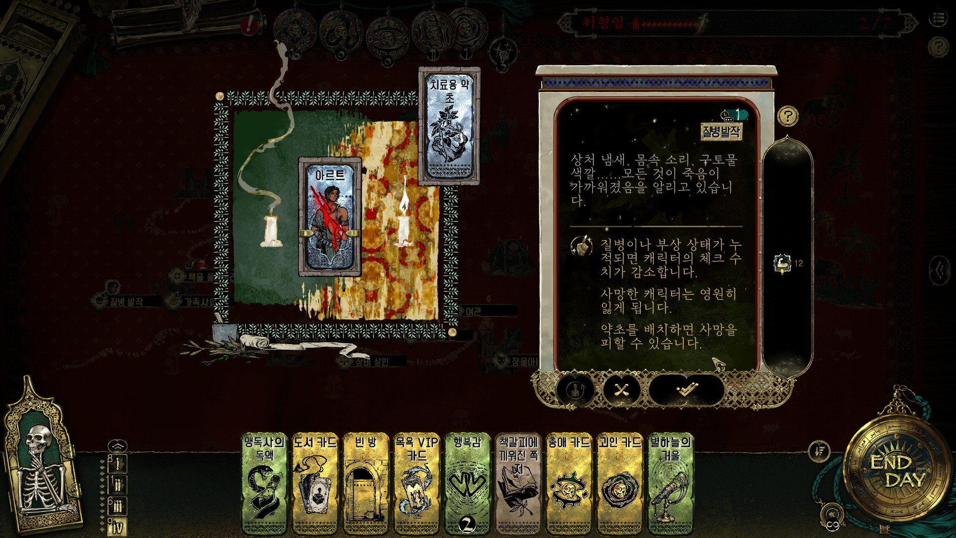 다치면 이렇게 약초로 치료할 수 있다.아예 내버려두면 위험해지지만 질병 발작이 발생하지 않으면 어차피 진료소에서 1골드면 치료된다.
