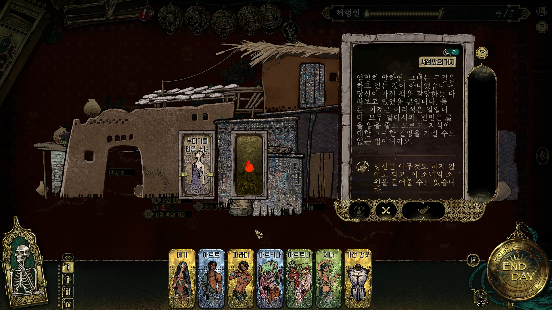 네페르가 서점에서 남겨준 쪽지를 찾아서 만나서 대화했다면,네페르 루트가 열린다. 네페르와 함께 어떻게 하면 이 막장 나라를 좀 사람사는 나라로 만들 수 있을까 고민하는 길로 간다.