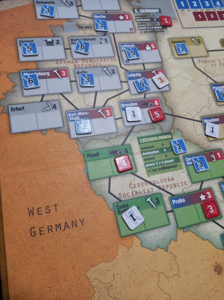 지역은 동독과 폴란드가 매우 중요하고, 헝가리와 체코슬로바키아, 루마니아가 비슷하나 루마니아는 승점 계산이 후반에 나오고 연계 카드가 많아서 예측하기 어렵다. 불가리아는 별로 중요하지 않은 느낌이다.